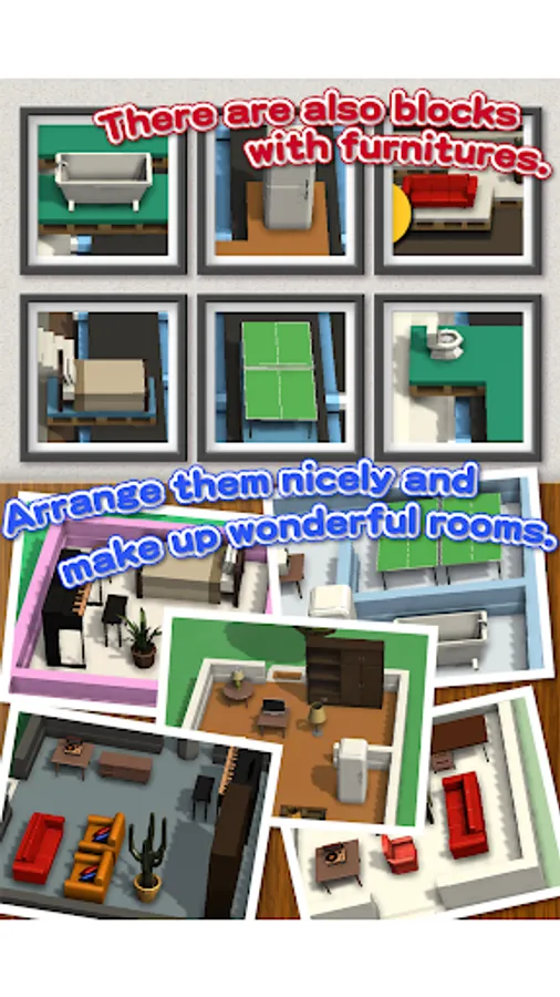 This is a puzzle game. You decorate stark rooms beautifully by putting blocks with furniture.