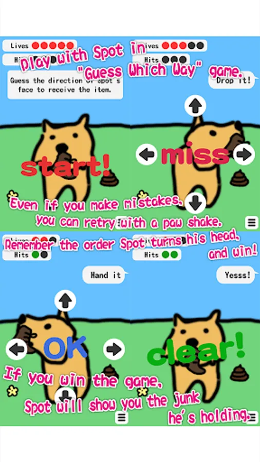 Engage in games with Spot to receive the collected items. Remember the sequence in which Spot turns his head and compete in the 'Guess Which Way' game. When you win, Spot lets go of the item and proudly shows it to you.