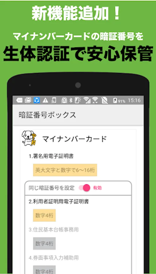 You can store the four PINs determined when issuing the Individual Number Card in the Polarify app.