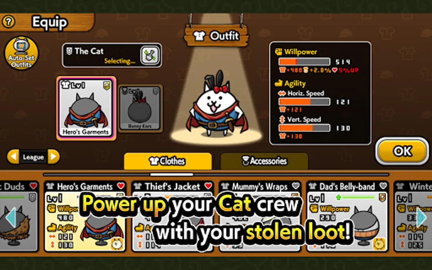 Use the loot you steal to upgrade your Cats! Earn more abilities and unlock new equipment!