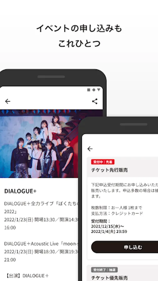 With just the app, you can accept lottery tickets, apply for first-come-first-served tickets, check history, and issue, display, and enter electronic tickets. Tickets purchased multiple times can also be distributed. Used tickets can also be collected in the gallery.