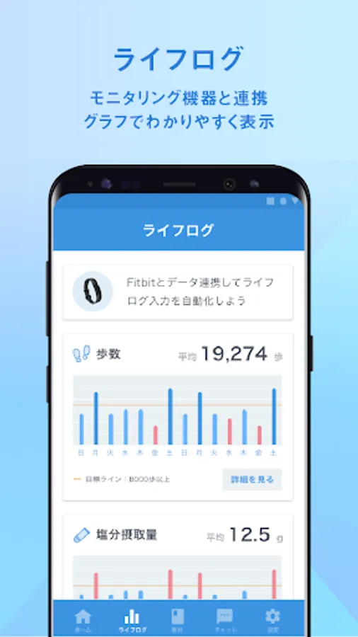 In order to give appropriate guidance according to your condition such as diabetes, obesity, high blood pressure, etc., the number of steps, exercise amount, sleep time, etc. are set by the "health care app" installed as standard on the iPhone and the dedicated device "Fitbit®". Get life log data automatically.