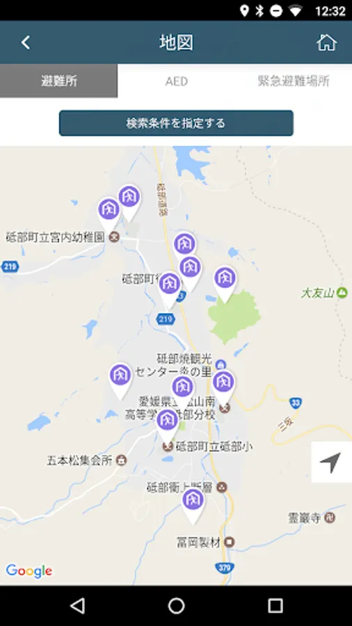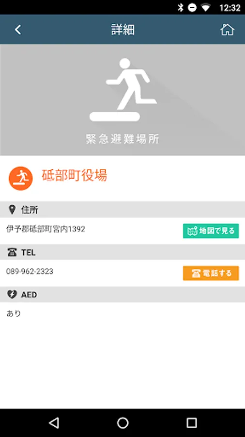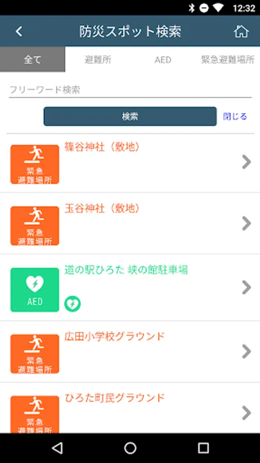 避難スポットを避難所・AED・緊急避難場所のカテゴリ別に分けてリスト画面とマップ画面で表示します。