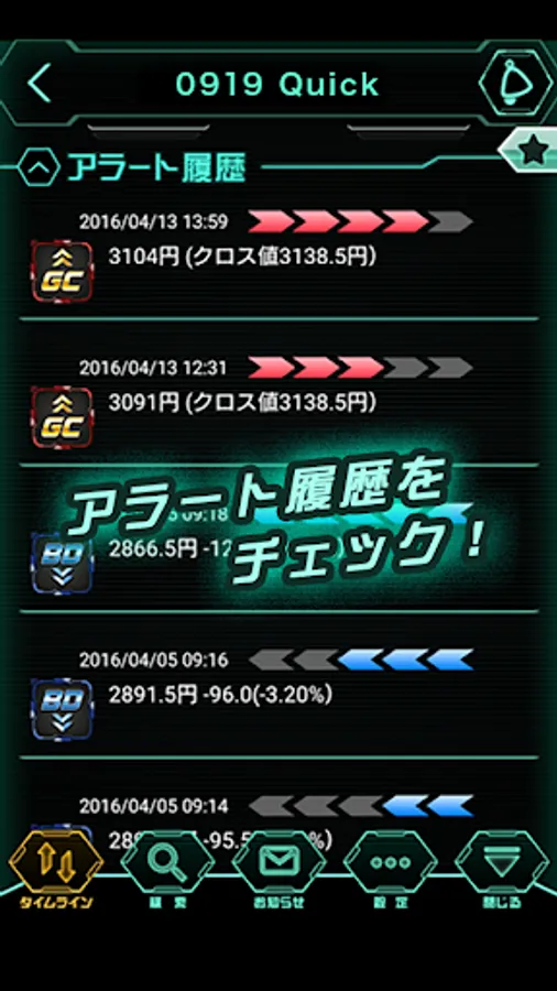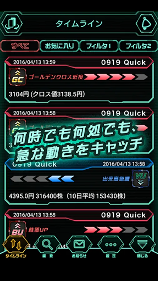 国内の全上場銘柄の株価・出来高、決算短信、Twitter上のニュースを監視し、注目するべき事象を検知した際、お客様の各種デバイス(PC・スマホ・タブレット)にポジティブ・ネガティブの度数をつけて、通知します。