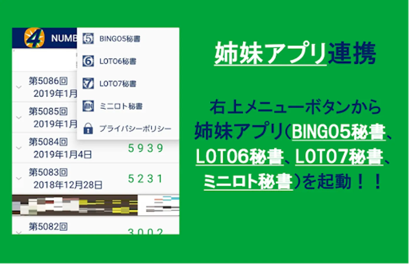 You can also easily launch sister apps (BINGO5 Secretary, LOTO6 Secretary, LOTO7 Secretary, Mini Lotto Secretary) just by tapping the menu button on the upper right.