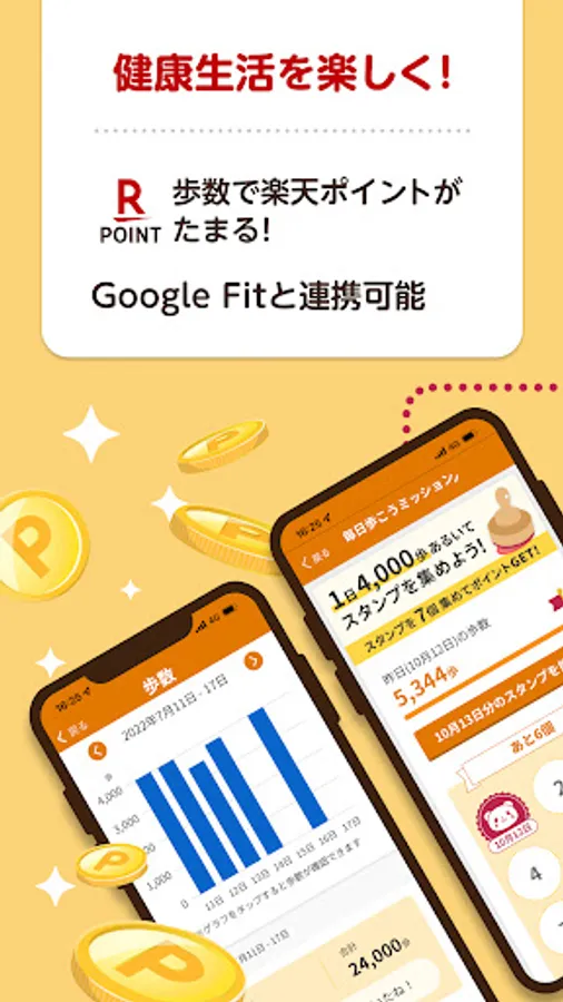 If you walk more than 4,000 steps a day, you can get a stamp the next day! If you collect 7 stamps every day, you will receive 3 Rakuten points.