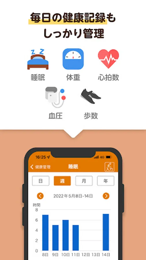 ・You can enter weight, sleep time, blood pressure, heart rate, height, and 5 types of health measurements.
