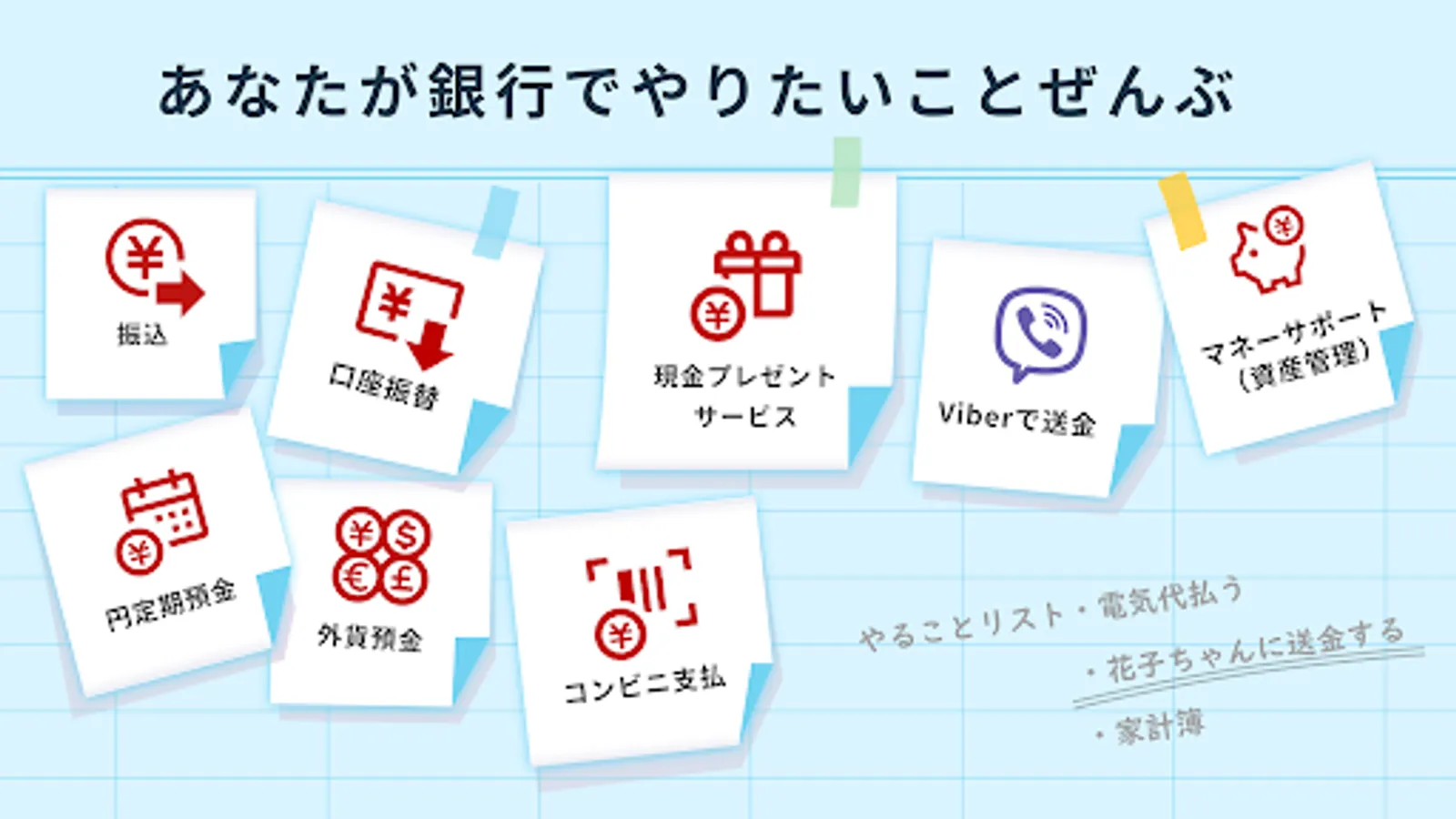 You can use it anytime, anywhere, 24 hours from the application, such as transfer procedures and checking the details of deposits and withdrawals.