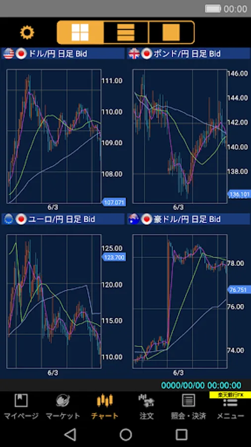 Is switched to full screen or 4 chart simultaneous display, you can comparison and trending of price movements between currency.