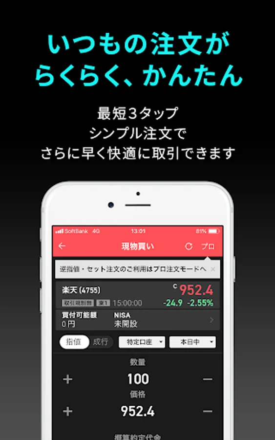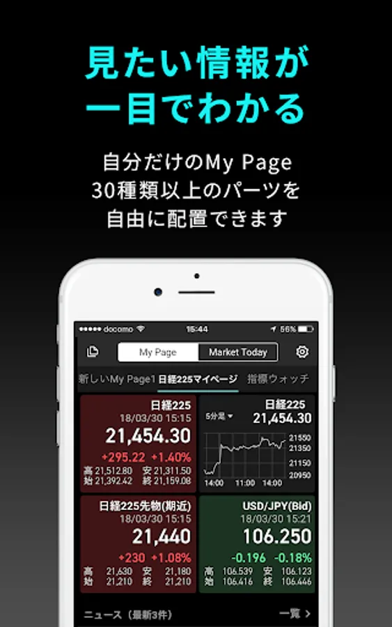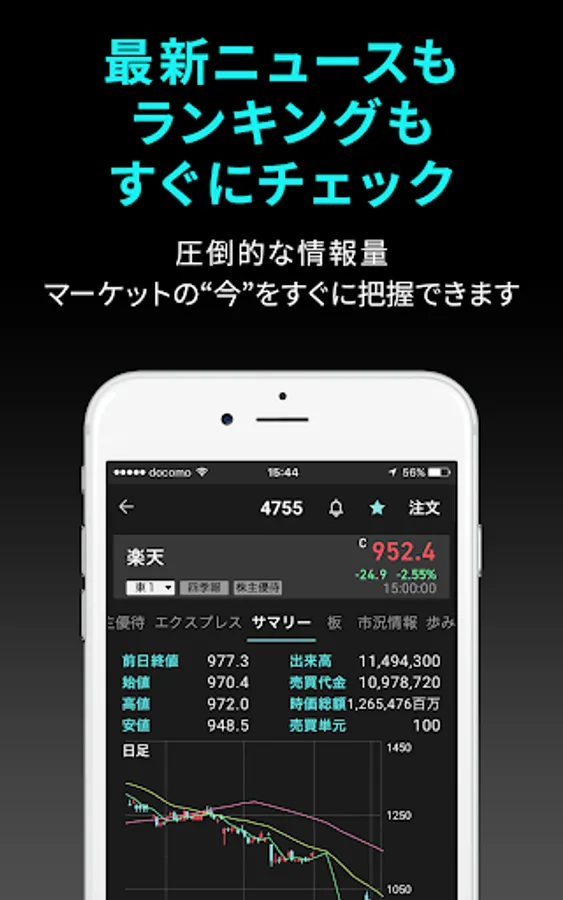 Stock order is available by one tap at minimum using Express order. And the user can change the screen to stock price chart easily to see the trends.