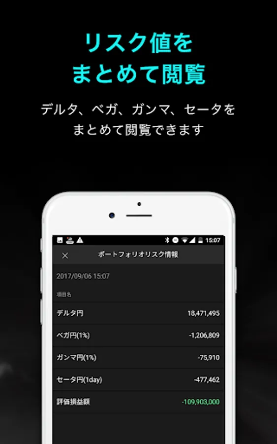 Greeks such as Delta, Gamma, Vega, etc. of portfolio basis can be displayed on "Portfolio risk function".
