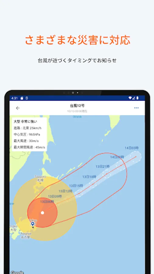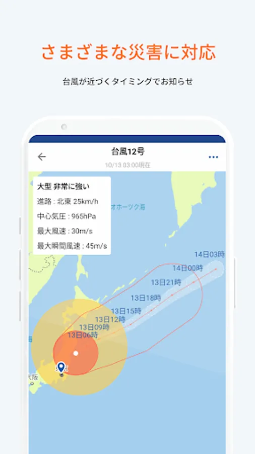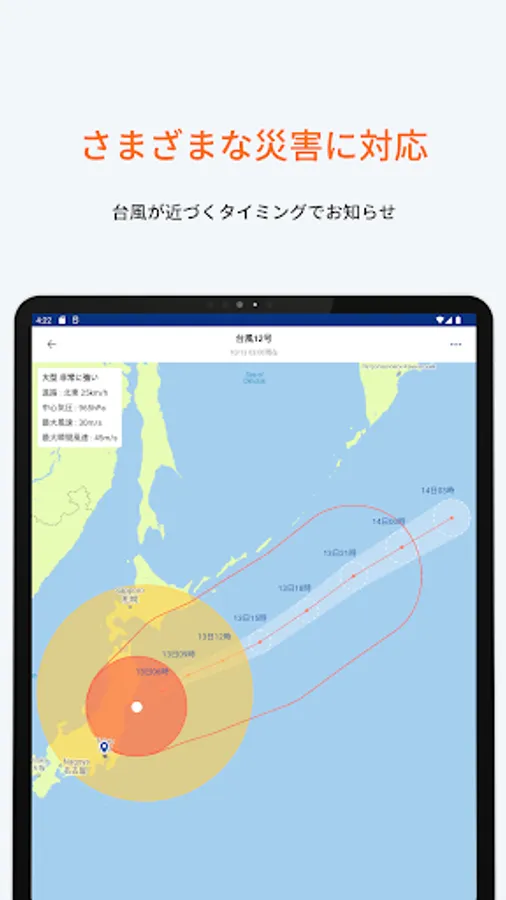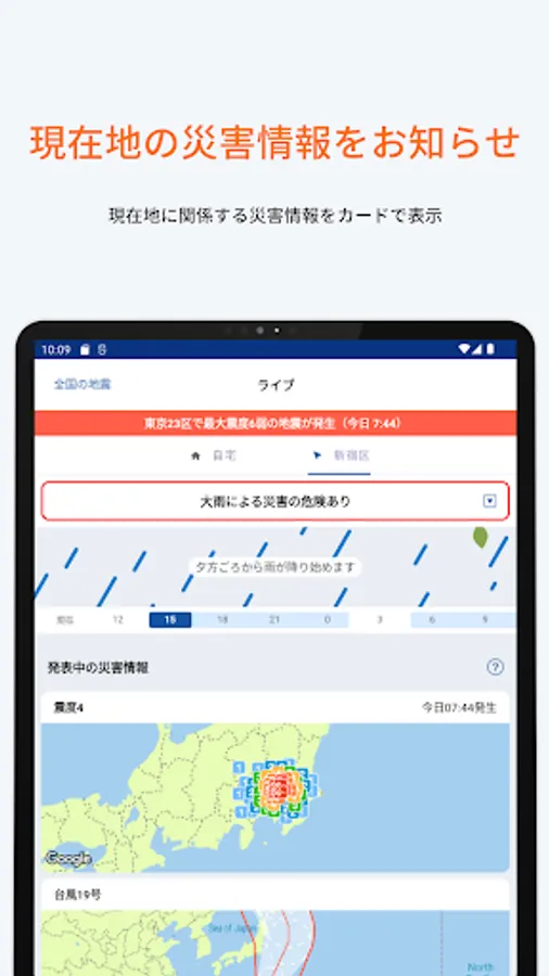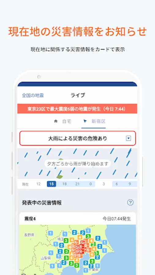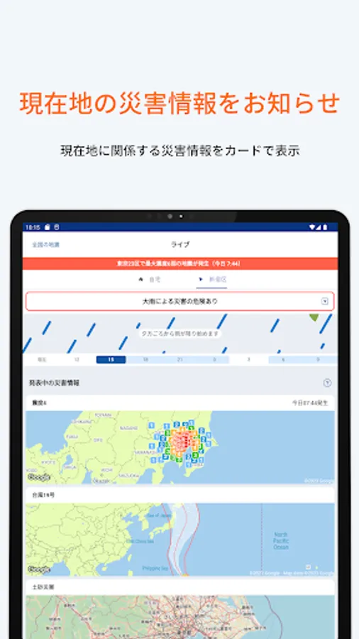 Supports various disaster information and evacuation information such as earthquakes, tsunamis, typhoons, heavy rains, and eruptions.