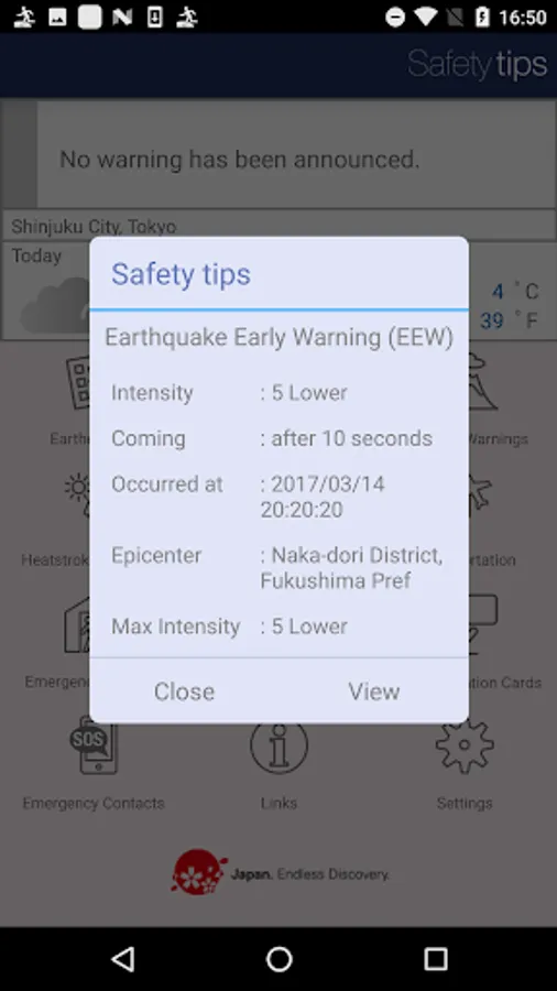 This Application notifies a user with EEW, Tsunami Warnings, Volcanic Warnings, Weather Warnings, Heat illness Warnings and Civil Protection Information issued in Japan. It is a free application developed under the supervision of Japan Tourism Agency.