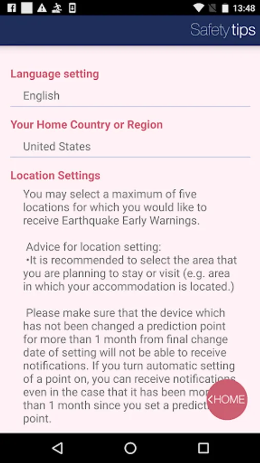 Before using the Application for the first time, select locations for which you wish to receive warnings from the Settings Menu (you may select a maximum of five locations (in Japan only))(*). Users will receive notifications when Earthquake Early Warning for local earthquakes of seismic intensity level 4 or greater, Tsunami Warning, Volcanic Warnings, Emergency Warnings , Heat illness Warnings, or Civil Protection Information are issued for the selected locations. Also, please make sure that the device which has not been changed a prediction point for more than 1 month from final change date of setting will not be able to receive notifications. If you turn automatic setting of a point on, you can receive notifications even in the case that it has been more than 1 month since you set a prediction point.