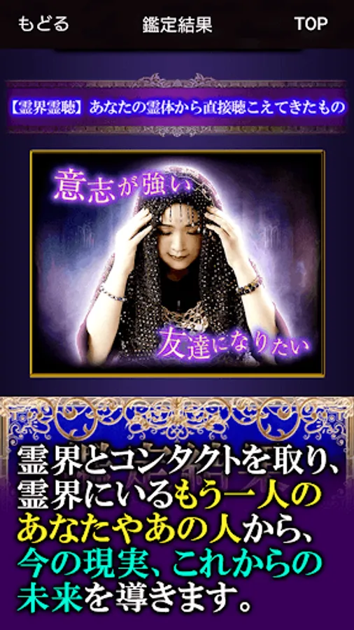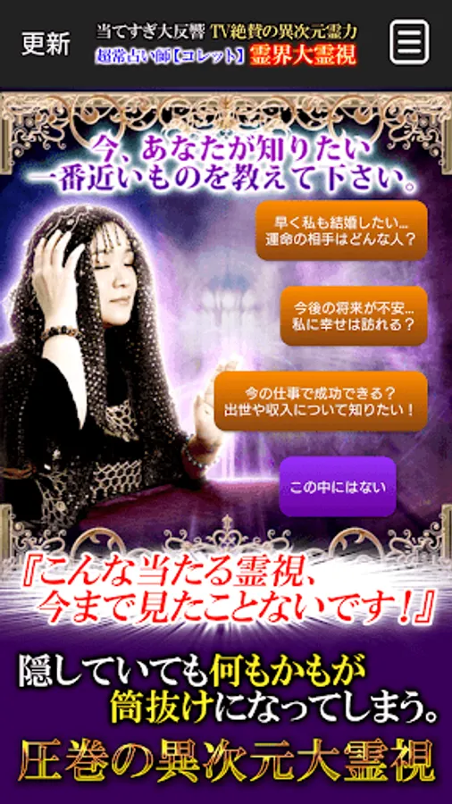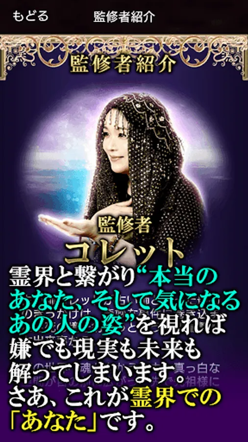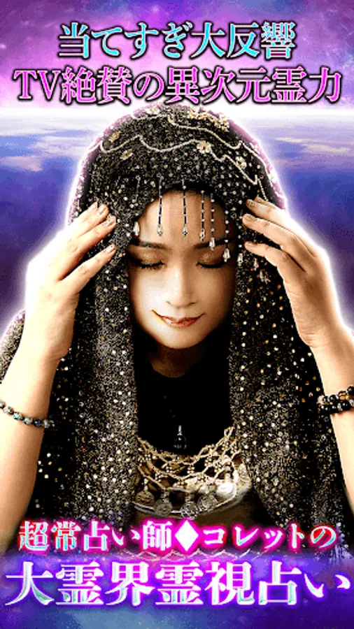 圧倒的な霊力であの人の本音もあなたの運命も露わにする超常占い師・コレットの霊視鑑定が登場。本鑑定「霊界大霊視」では、霊界にいる“もう一人のあなたの姿(霊体)”と繋がり、今のあなた自身の運命や感情、未来に与えている影響や出来事を特定していきます。