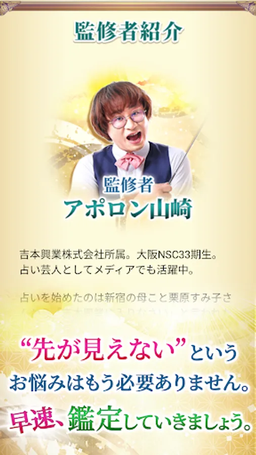 hello everyone. I'm Apollon Yamazaki, a fortune teller. I have been appraising more than 70,000 people so far, and I can say clearly. By doing a fortune-telling appraisal, your fortune can be improved. You may have troubles or feel awkward ... I want to help you in such a case! want to protect! While thinking so, I am appraising every day.