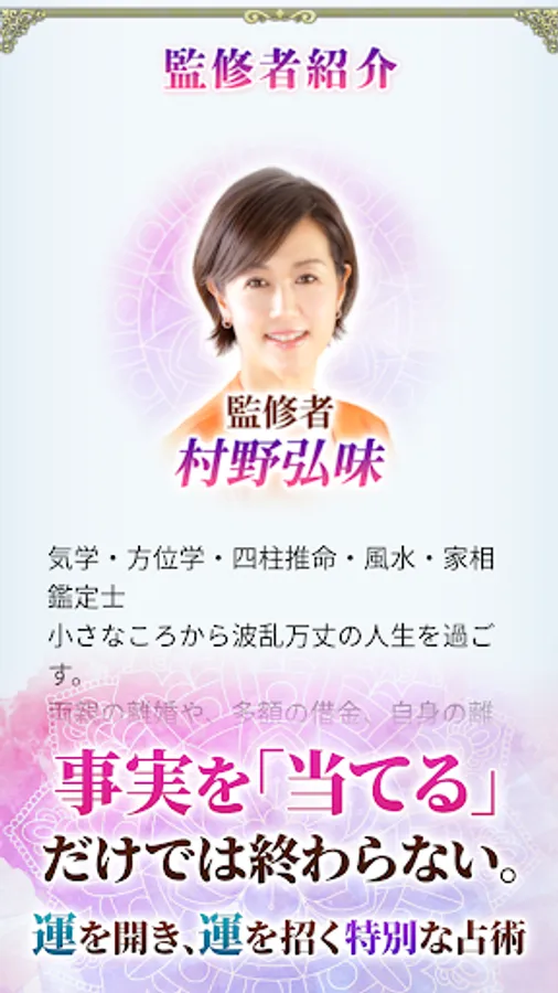 Parents' divorce, large amount of debt, own divorce, company bankruptcy... After experiencing many difficulties, encountering fortune-telling in one's life, and knowing the importance of orientation, enter the world of Kigaku. When things don't go well, I know because I experienced the pain of hard times. I am helping you.