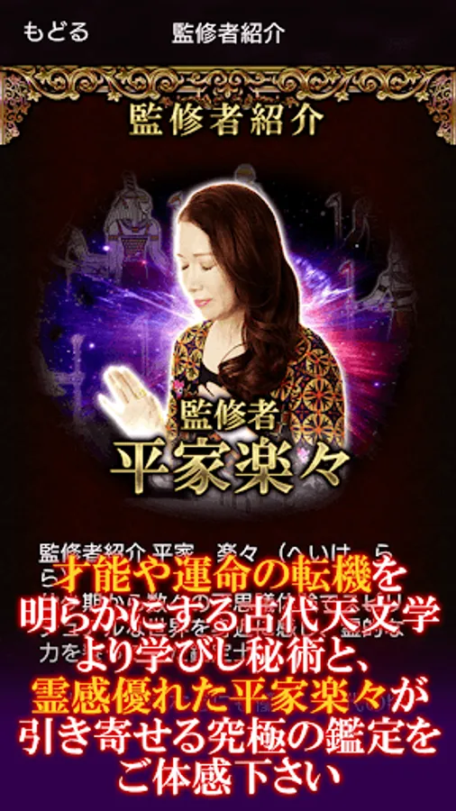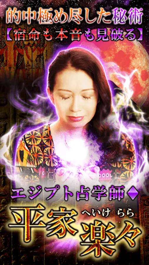 愛を叶え、良縁や運命の伴侶を特定する数理術をルーツとする秘占、才能や運命の転機を明らかにする古代天文学より学びし秘術と、霊感優れた平家楽々が引き寄せる「エジプシャンタロット」では今を悩み、迷うあなたの助けとなるでしょう。