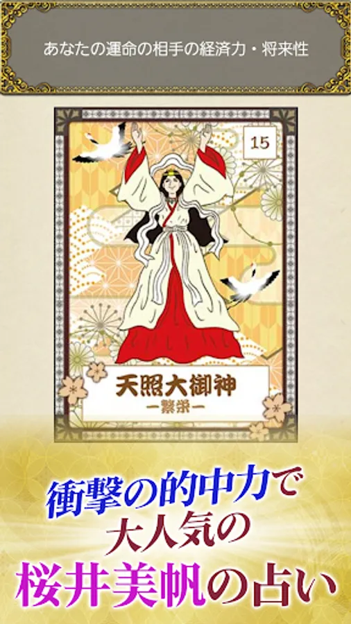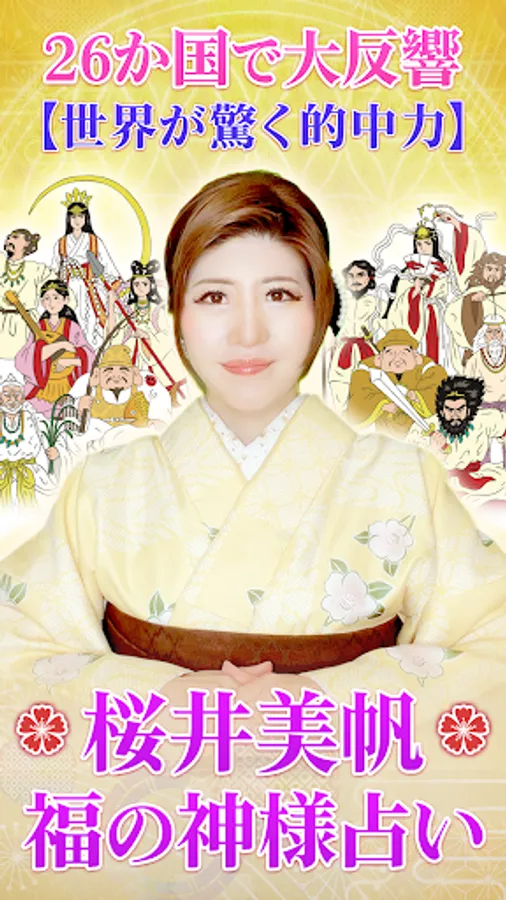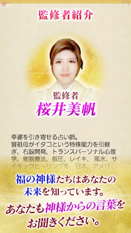 Hello, I'm Miho Sakurai, who attracts good luck and elevates you. In this "God of Fortune Fortune-telling", the strongest 12 gods that lead to "good luck" among the gods of Japan will make you mentally and financially rich and give you an appraisal so that you can walk a "happy super good luck life". you can do