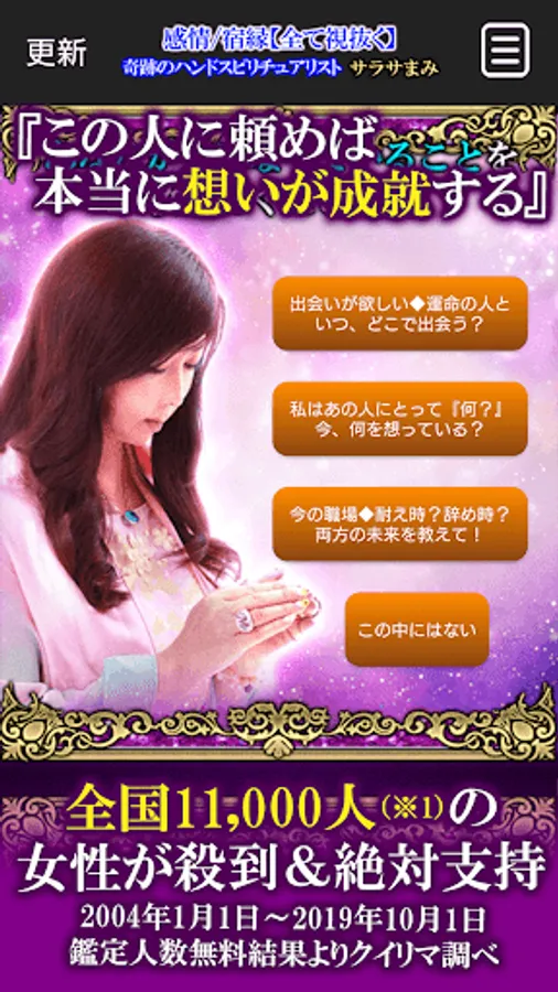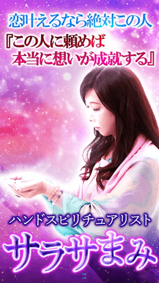 奇跡招くハンドスピリチュアリスト“サラサまみ”の的中鑑定で、あなたの事も好きなあの人の事も全て視抜き想いを叶えます。