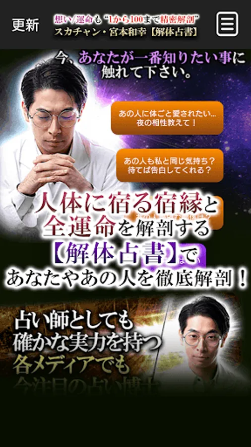 Please experience the fortune-telling of the attention-grabbing fortune-telling doctor "Kazuyuki Miyamoto" at your fingertips.