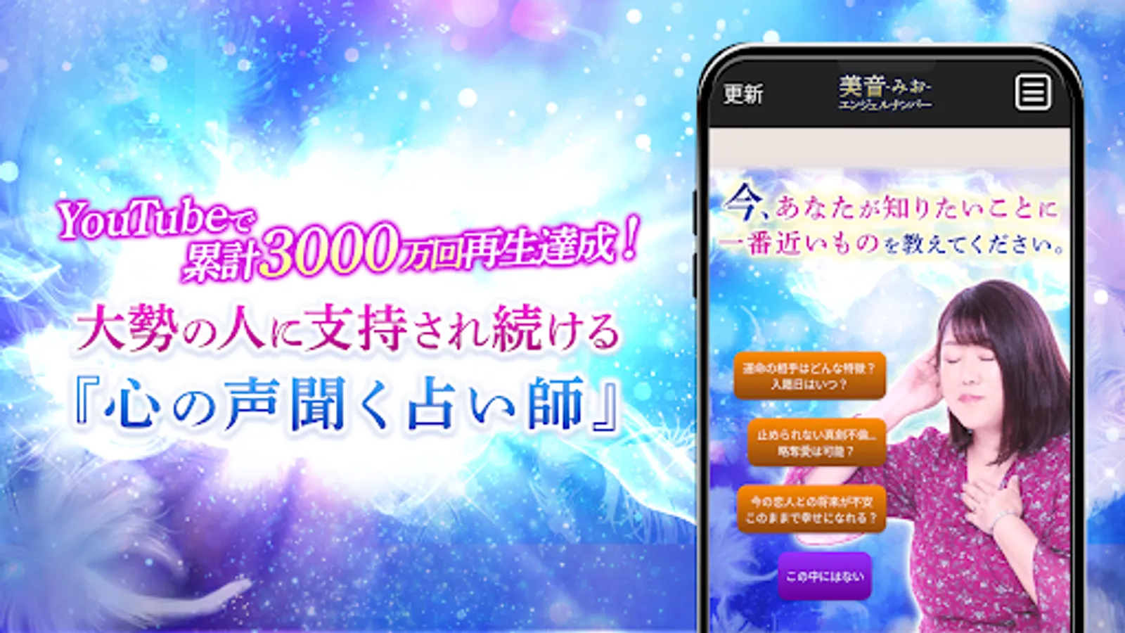 Spiritualist Mion boasts overwhelming popularity. A fortune-telling that was supported by 60,000 people in just four years, spread only by rumors that it would be a hit. People's thoughts, the future to visit, hints for improving the situation. A special number of messages hidden on your birthday will lead you to love fulfillment and life improvement.