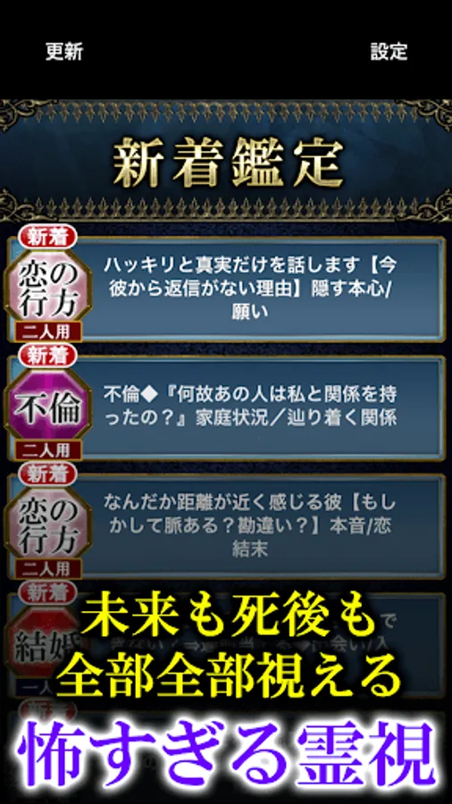 ※一度ご購入された占いも、「違った端末でアプリを再インストールした場合」や、「一度アプリをアンインストールしてから再度インストールし直した場合」には再購入が必要です。こちらご承知下さいませ。