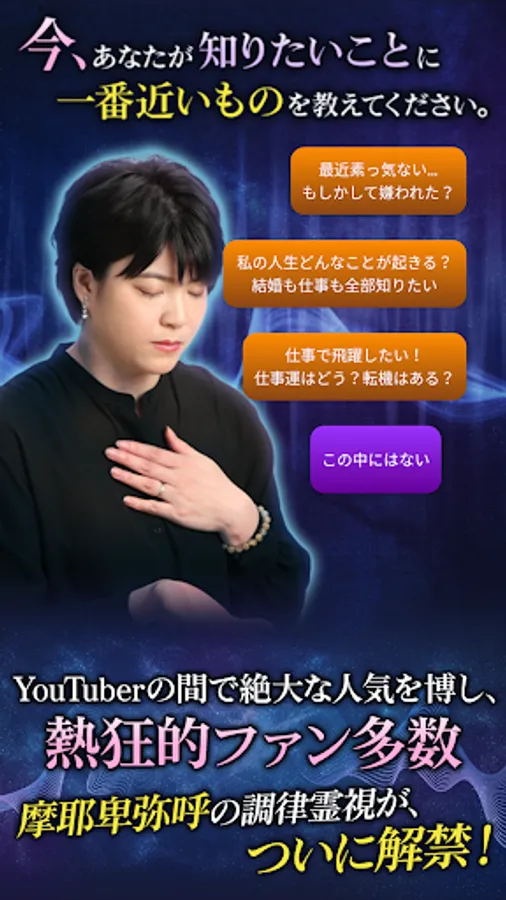 She gained popularity as a psychic in Kumamoto, the land of fire, and was featured on famous YouTubers and TV programs. Please enjoy her fortune-telling, which is popular in the media and boasts overwhelming accuracy, at your fingertips.