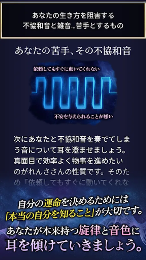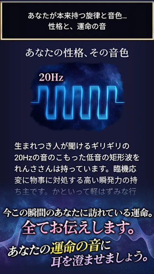 The "spiritual tuning" that adjusts the current unfavorable situation with strong inspiration will see through your present and guide you to the correct reality. The power from her... please accept it.