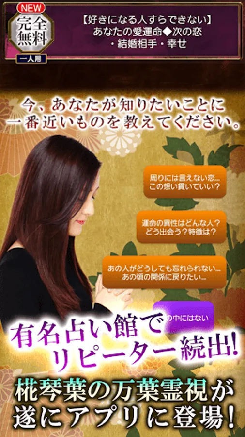 People's feelings change. That's why it's painfully beautiful. The popular fortune-teller "Kabakotoha" has many repeat customers. Her treasured psychic "Manyo psychic" will come to you.