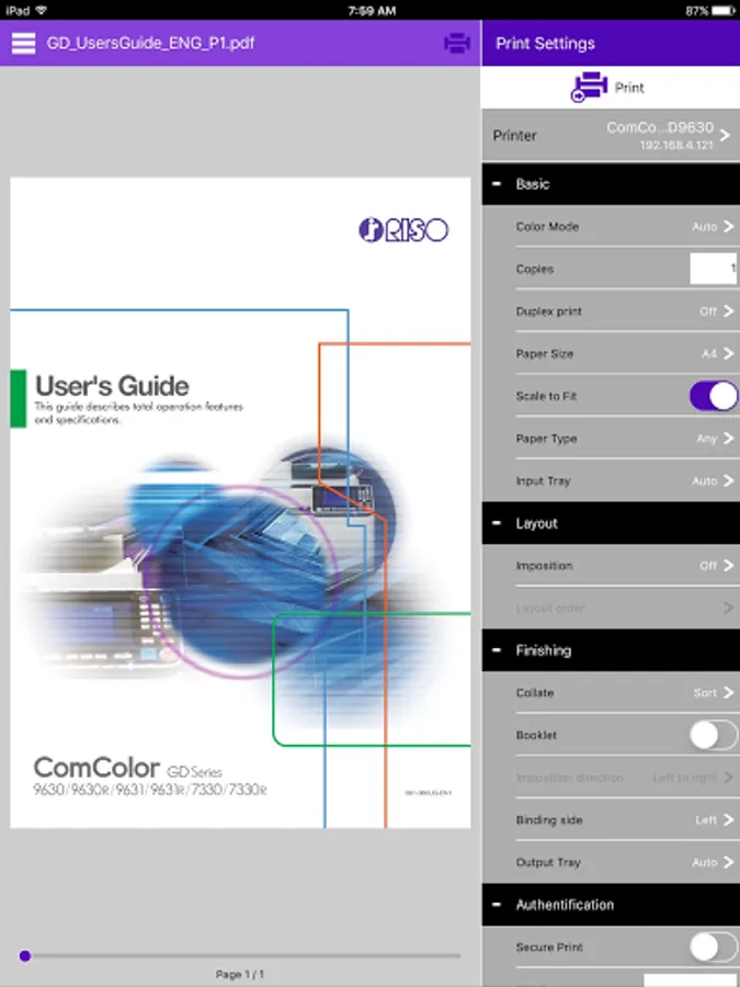 RISO PRINT-S is an application to print PDF, text, or photo/image data directory from the tablets or the smartphones.