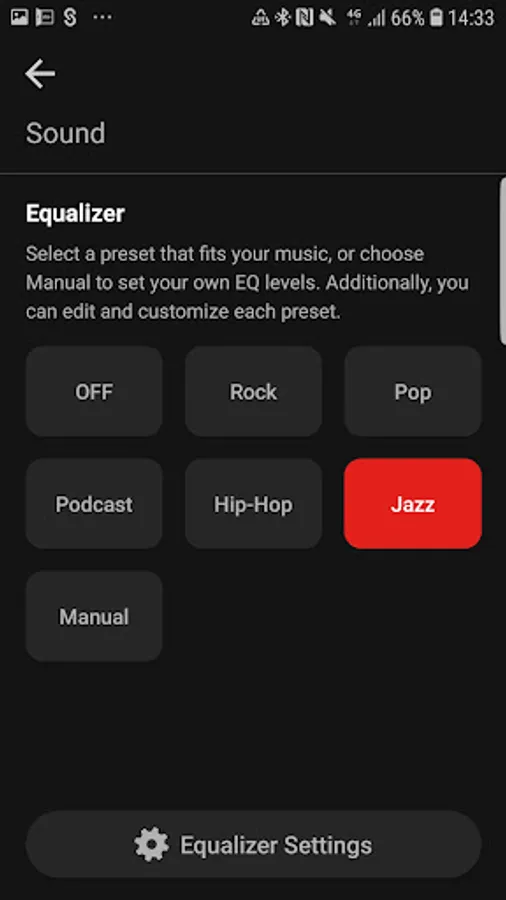 The EQ tool allows you to select the perfect Sound EQ preset for whatever you’re listening to. Take matters into your own hands by customizing each level to your liking, or create your own sound signature entirely from scratch.