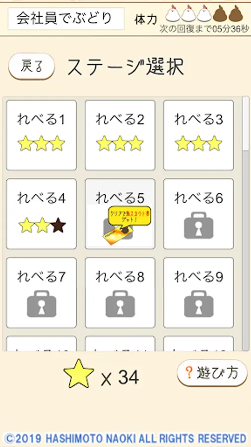 より少ない操作回数(持ち上げる×落とす)でクリアできると最大星3個の高評価がつきます。