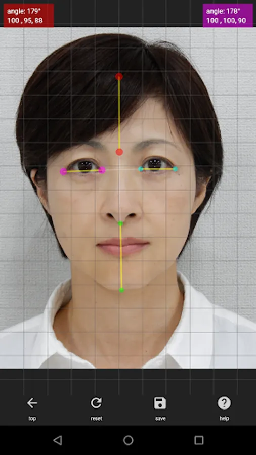 The angle between two segments(①-② and ③-④) is displayed on the top of the screen.