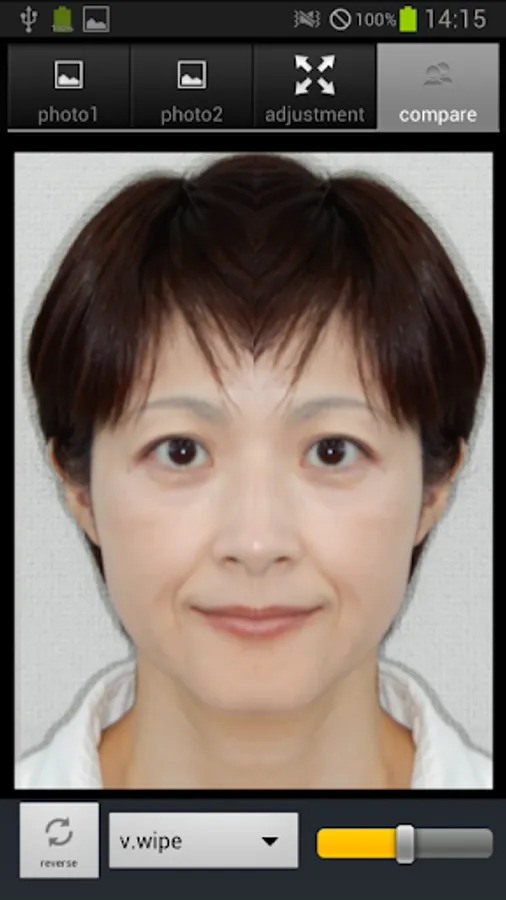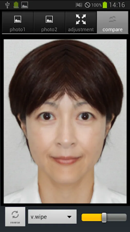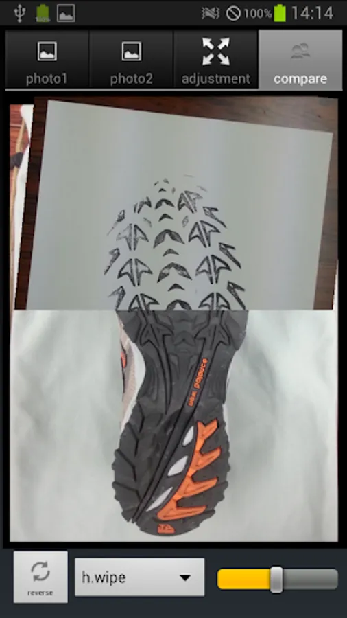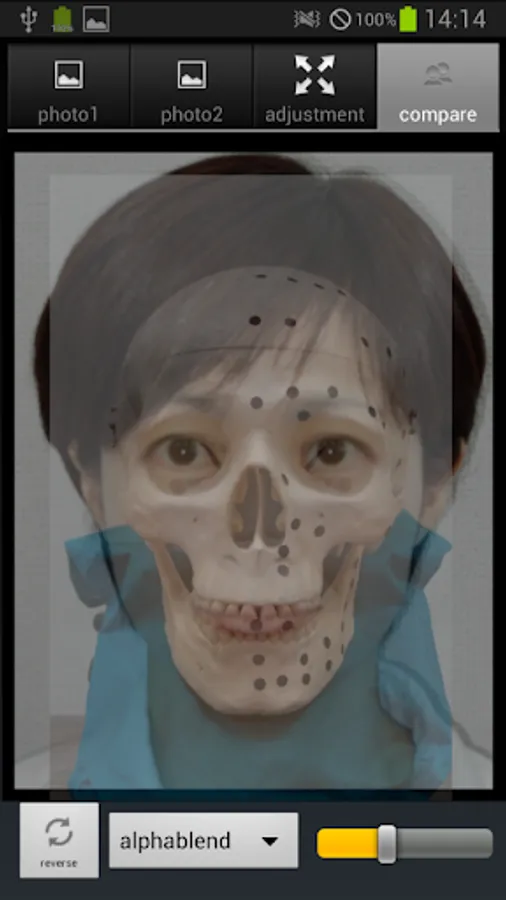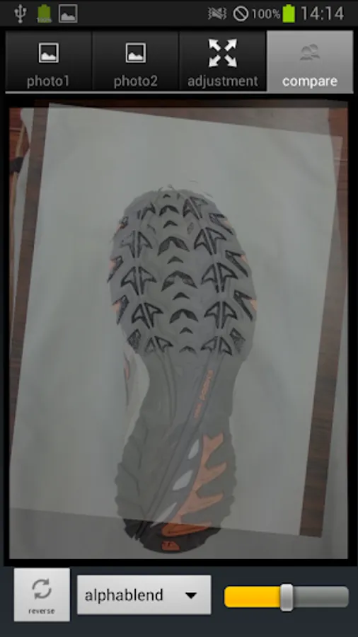 For example, display a sports player's form which you want to imitate on "photo1" and display your form on "photo2", adjust the position and size of two photos. Then select display type (alphablending, vertical wipe or horizontal wipe) and move a handle of SeekBar, you can find your fault !
