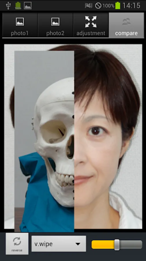 Using "PoseChecker", you can compare two photographs. It has three display types, "SuperImpose (alphablending)", "Vertical-Wipe" and "Horizontal-Wipe". Of course, you can adjust the size and position of two photographs.