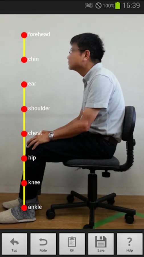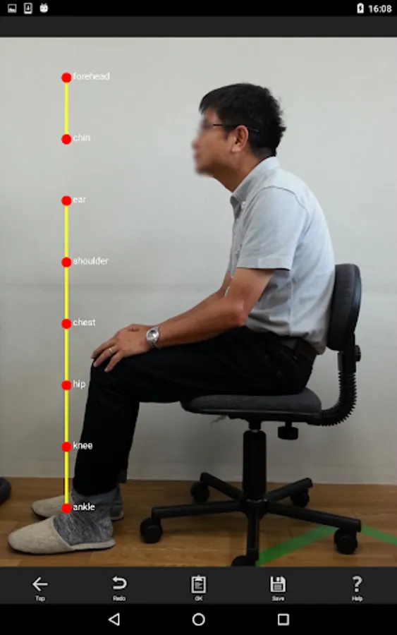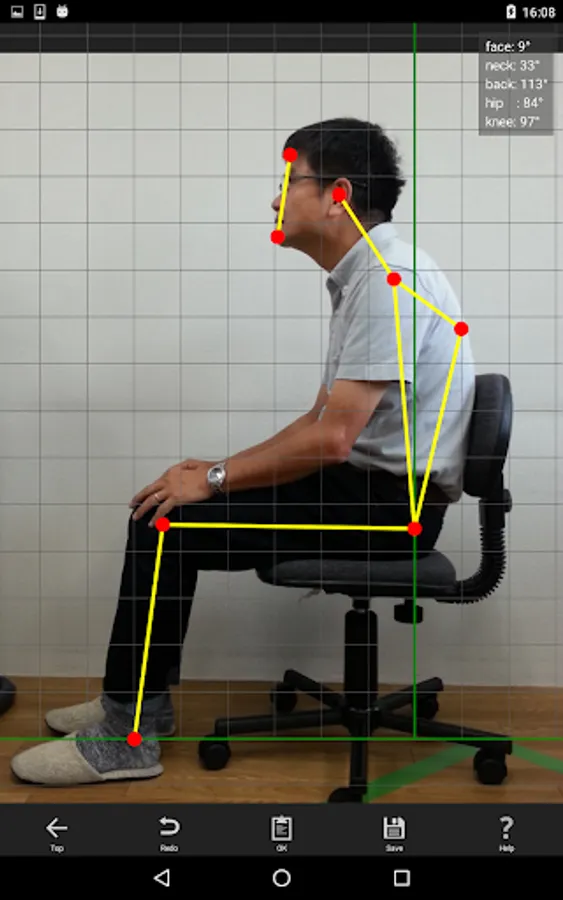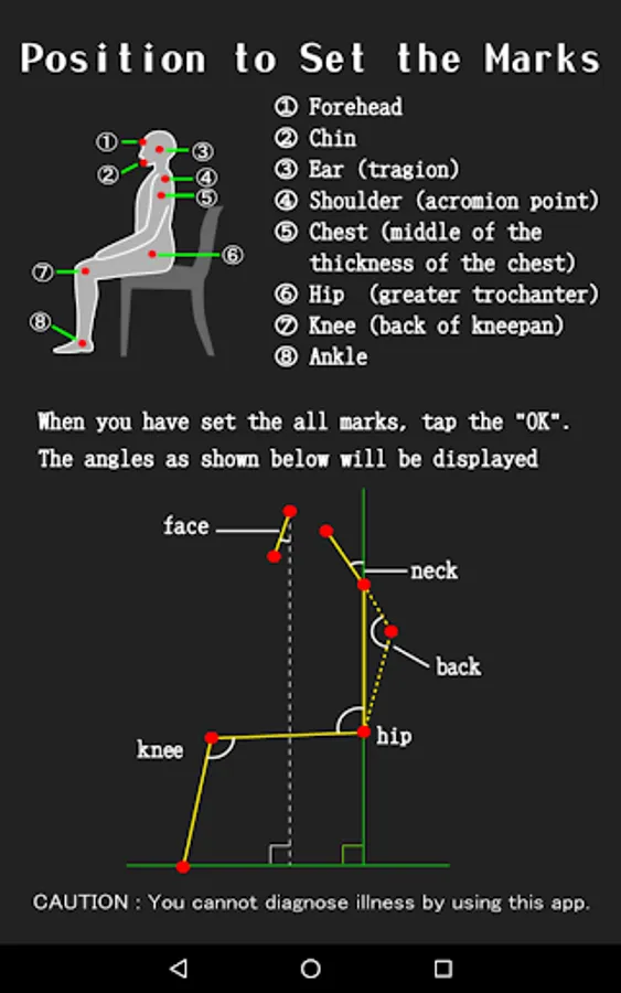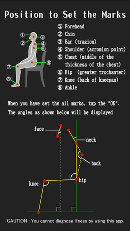 Set the marks at the positions which are forehead, chin, ear, shoulder, chest, hip, knee and ankle, and tap the "OK" . You can get the angles as shown below.
