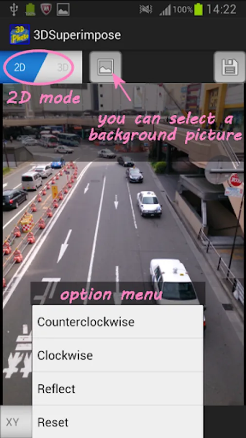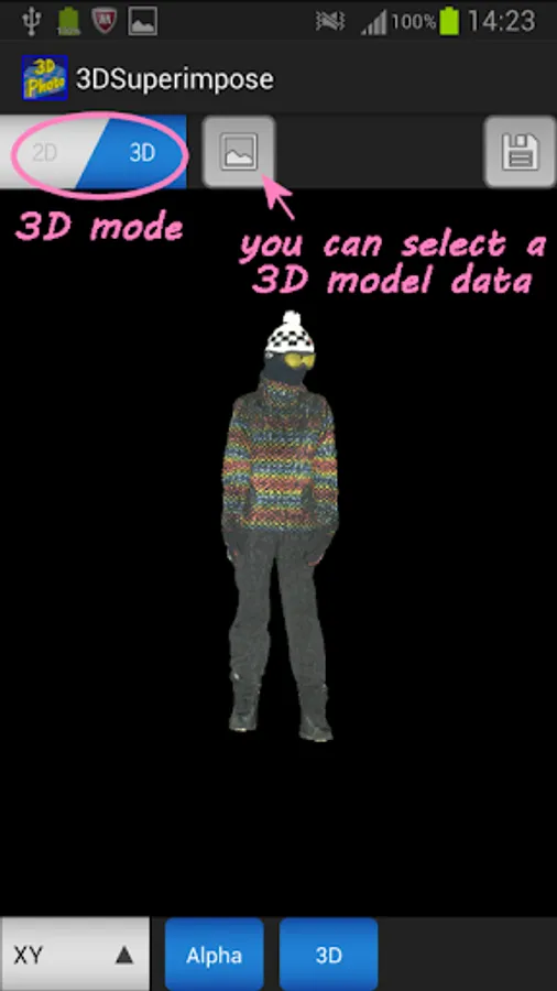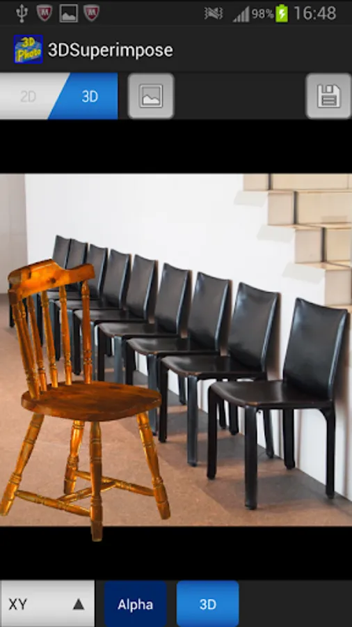 "3DSuperimpose" is the application that superimpose 3D model on the photo. First, pick a photo from your gallery, and then load a 3D model data. Of course, you can change the size, position or direction of photo and 3D model data. And you can save the screenshot as JPEG format.