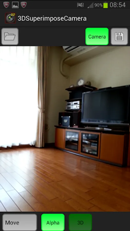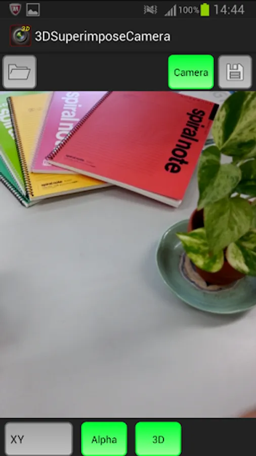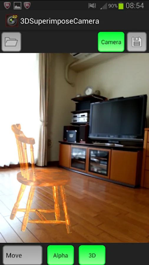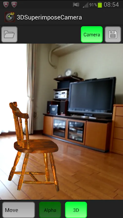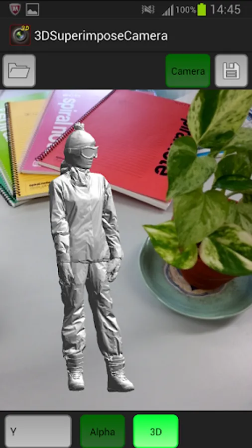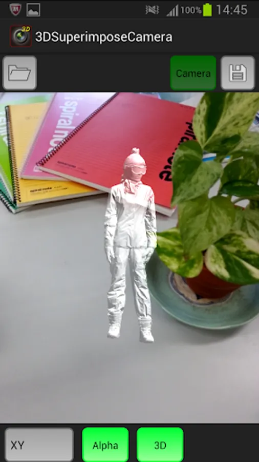 "3D SuperimposeCamera" is the application that superimpose 3D model on camera preview. Of course, you can change the size, position or direction of the 3D model data. And you can save the screenshot as JPEG format.