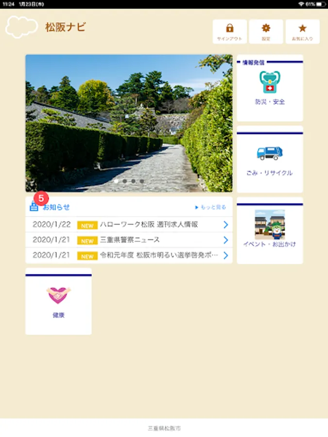 『松阪ナビ』は、松阪市の「ごみ出し」についてなど、生活に役立つ様々な情報をはじめ、市公式ホームページと連動して、ホームページの新着情報やイベント情報も発信し、皆さまの暮らしをサポートするアプリです。