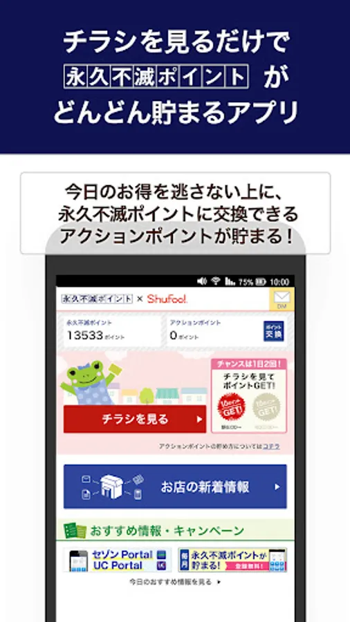 Eternal Immortal Points x Shufoo! Not only allows you to browse more than 100,000 leaflets nationwide such as supermarkets, drug stores, and department stores for free, but also action points that can be exchanged for permanent immortal points just by looking at the leaflets (100 action points = 1 permanent) Immortal points) can also be accumulated!