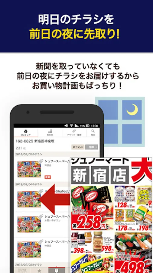 First, log in with the ID of the Internet service you are using and register the area where you want to see the leaflets as "My area". You will receive a leaflet every day. Tomorrow's leaflet will arrive the night before, so your shopping plan is perfect!