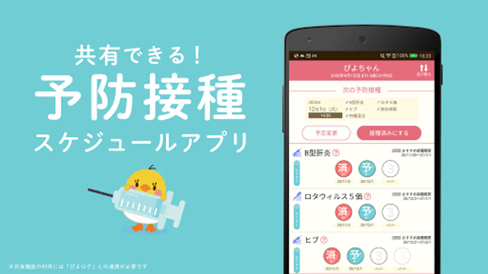 Vaccination starting from 2 months after birth, there are many types and times, and setup is difficult! It is an app that makes it easy to see and manage what you are inoculating and what is left. By linking with the childcare record "Piyolog", the couple can share the schedule and the vaccination record can be reflected on the childcare record side.