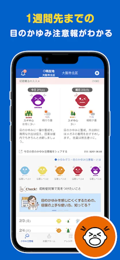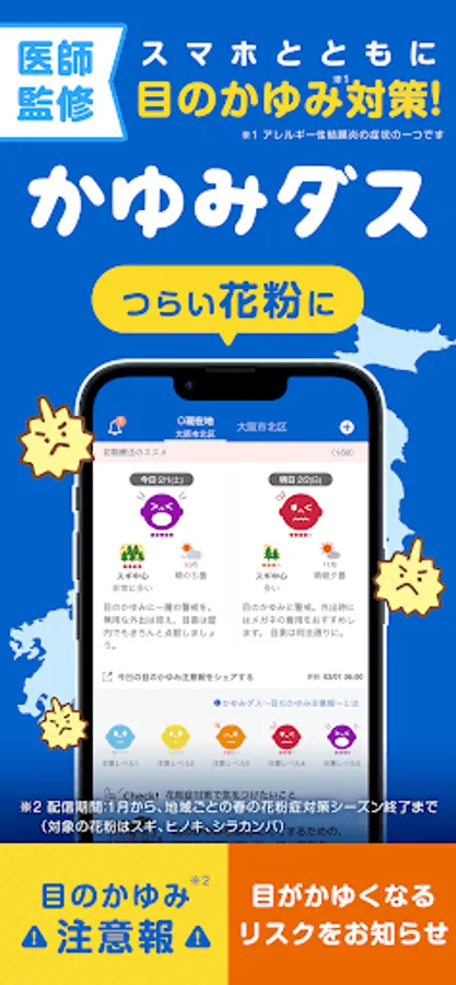 *The "Itchy Eye Warning" is a forecast service provided by JMDC Co., Ltd. and the Japan Weather Association. "Itchy eye warnings" are the results of calculations that statistically link the relationship between weather information and allergic conjunctivitis, and do not necessarily predict the onset of allergic conjunctivitis.