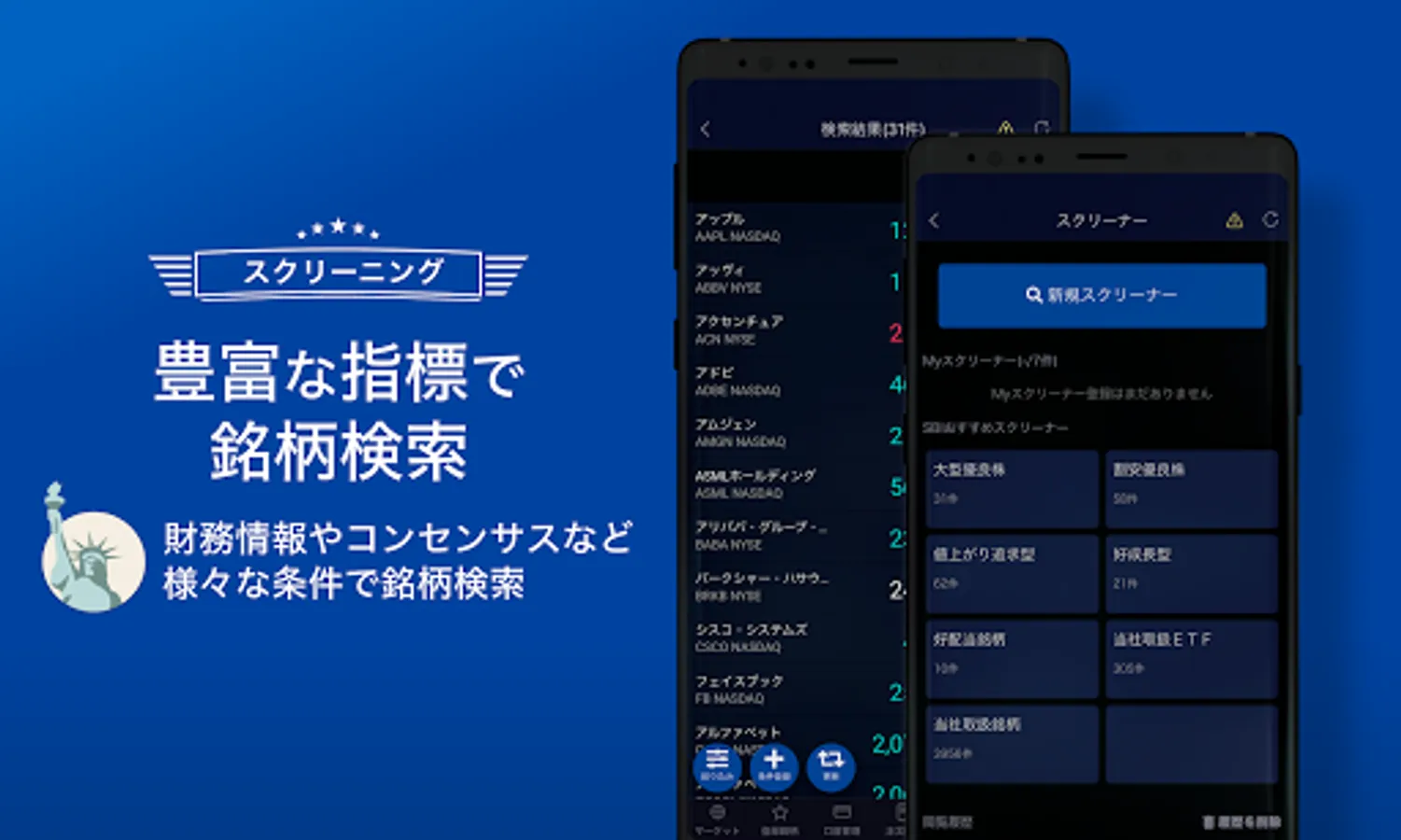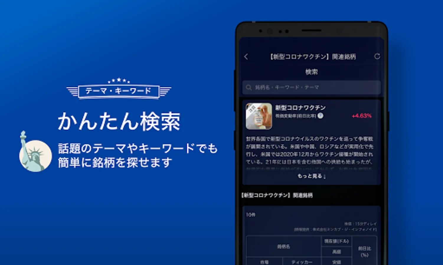 Equipped with "Featured themes" that are carefully selected every month, "Keyword search" that searches for stocks with ambiguous words, and "Screener function" that searches for stocks by narrowing down financial conditions, industries, technical indicators, etc.