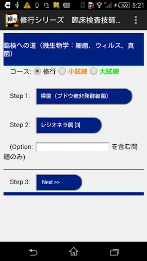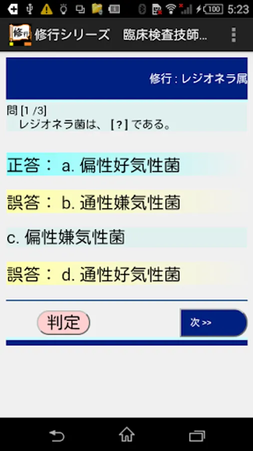 コース:修行では、各問題ごとに正否を判定できます。 解答選択肢の一つを選択し、 正否を「判定」します。「 次へ>>」: 次の問題へ移ります。一通りの問題を終えると、正否とまとめが提示されます。(Option: キーワードを入力すると、それを含む問題のみになります。合致しない場合は、問題が提示されません。通常は、未入力にしておいて下さい。)