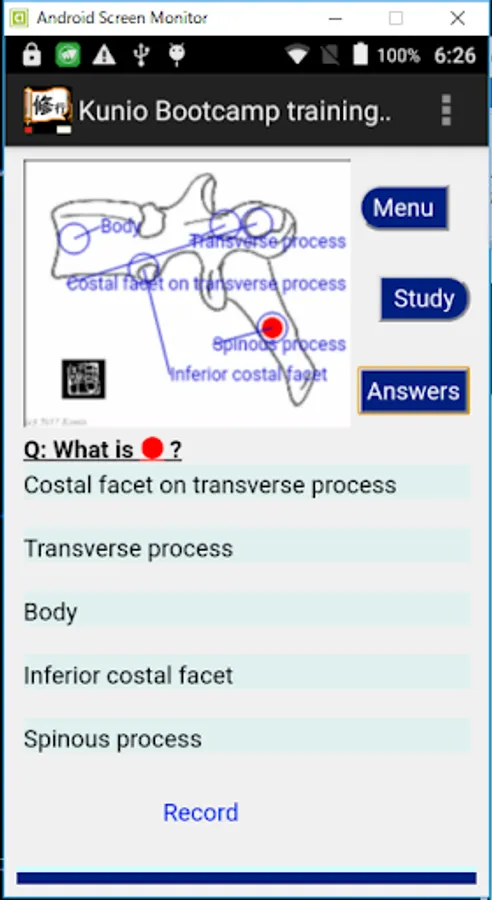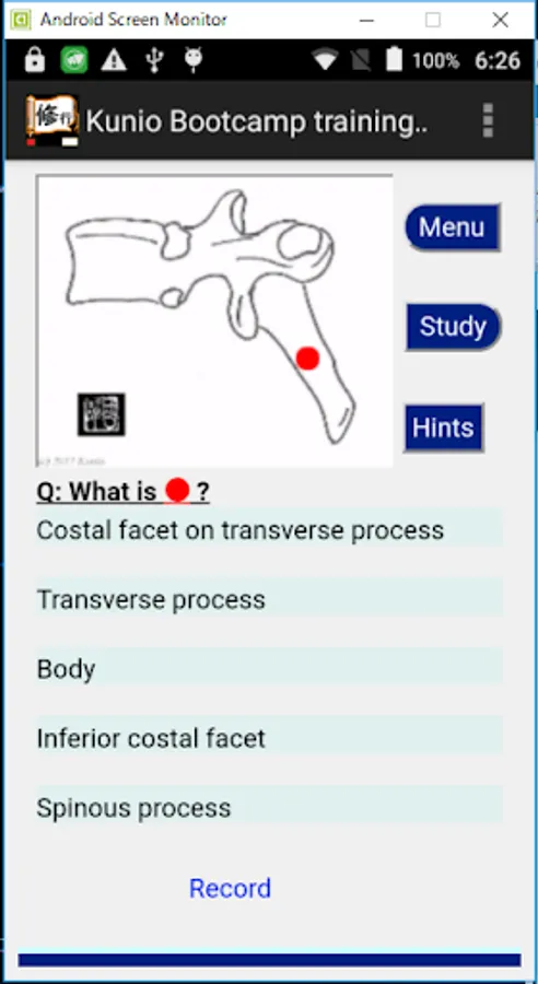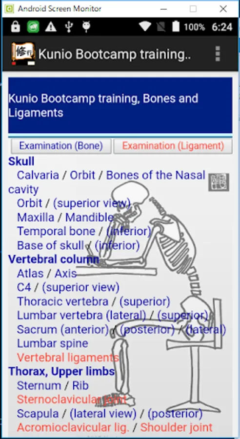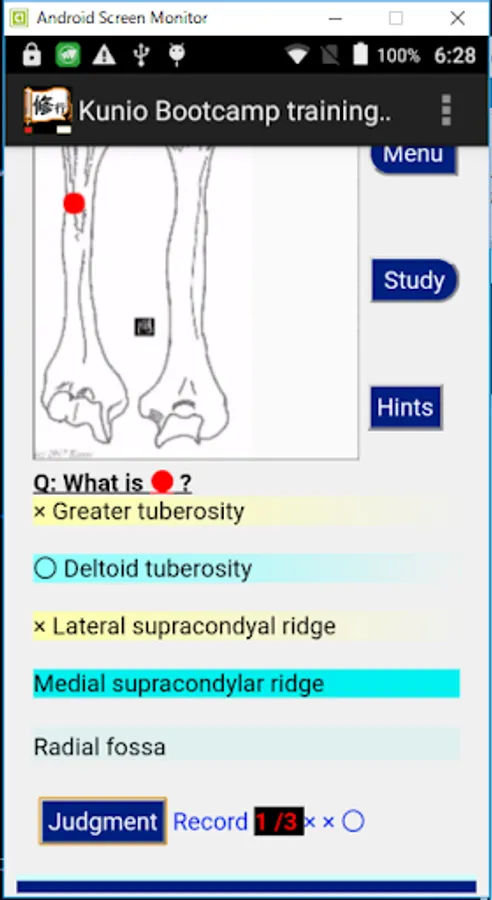 •By selecting, and then clicking on a term for a “bone” or a “ligament” in the first screen, the proper figure is displayed with a question and an indicator. When either, “Examination (Bones or Ligaments)” is clicked, a random question along with an indicator is displayed.