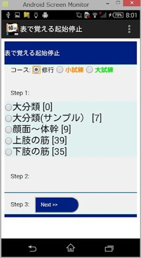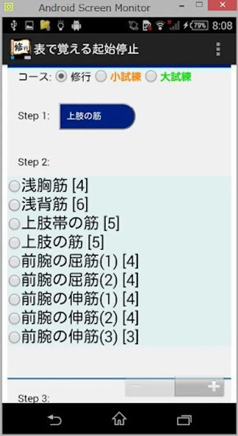 筋の起始・停止・作用・神経支配が覚えられない!?そんな方に繰り返し復習できる表形式のアプリを作成しました。柔道整復師(柔整師)、OT、PTなど、医療系資格の学生さん向きです。 (1)筋群(筋)を選択し、(2)適当なキーワードをタッチで交換して、表を完成させる学習ゲームです。 (※起始や停止などは文献により多少違いがあります) 1、2年生は授業内容と並行して、基礎の確認・復習に役立てて下さい。3年生は国家試験に向けての復習や忘れてしまった内容の確認などに役立てて下さい。