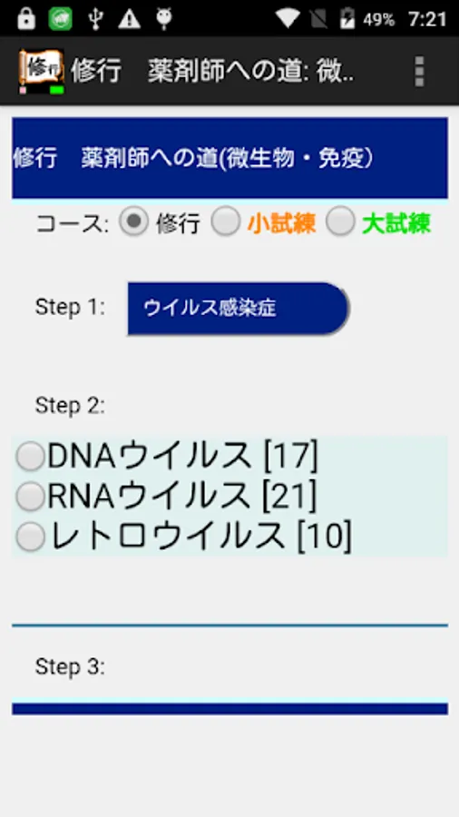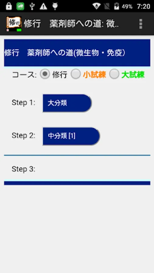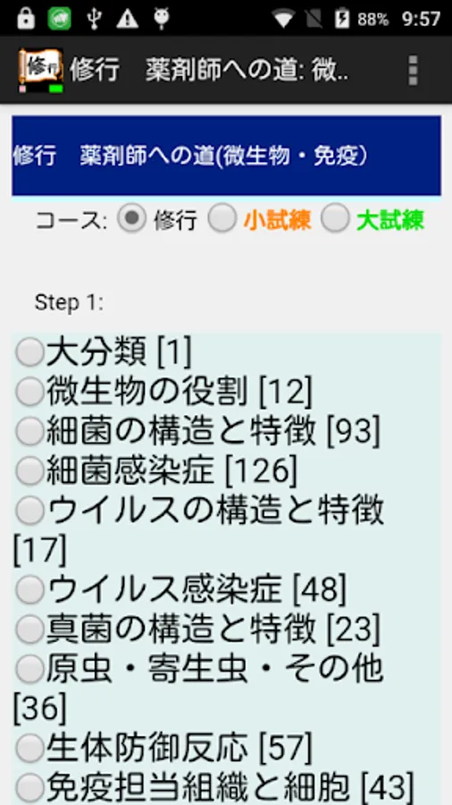 コース: 修行、小試練(小分野の範囲のテスト)、大試練(大分野の範囲のテスト)を選択します。