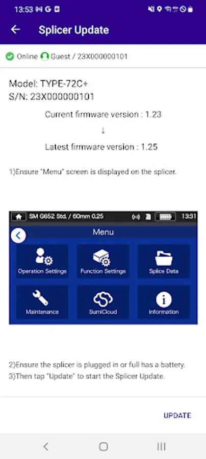 By using the app with Sumitomo Electric's applicable splicers, you will be able to ensure that your machine and your accessories will be up-to-date and fully functional, while cutting down on time and work needed to communicate splice results both internally and externally to your organization. The app will also assist you to manage your splicer as an asset by providing security features, and during work with useful tips and tricks.